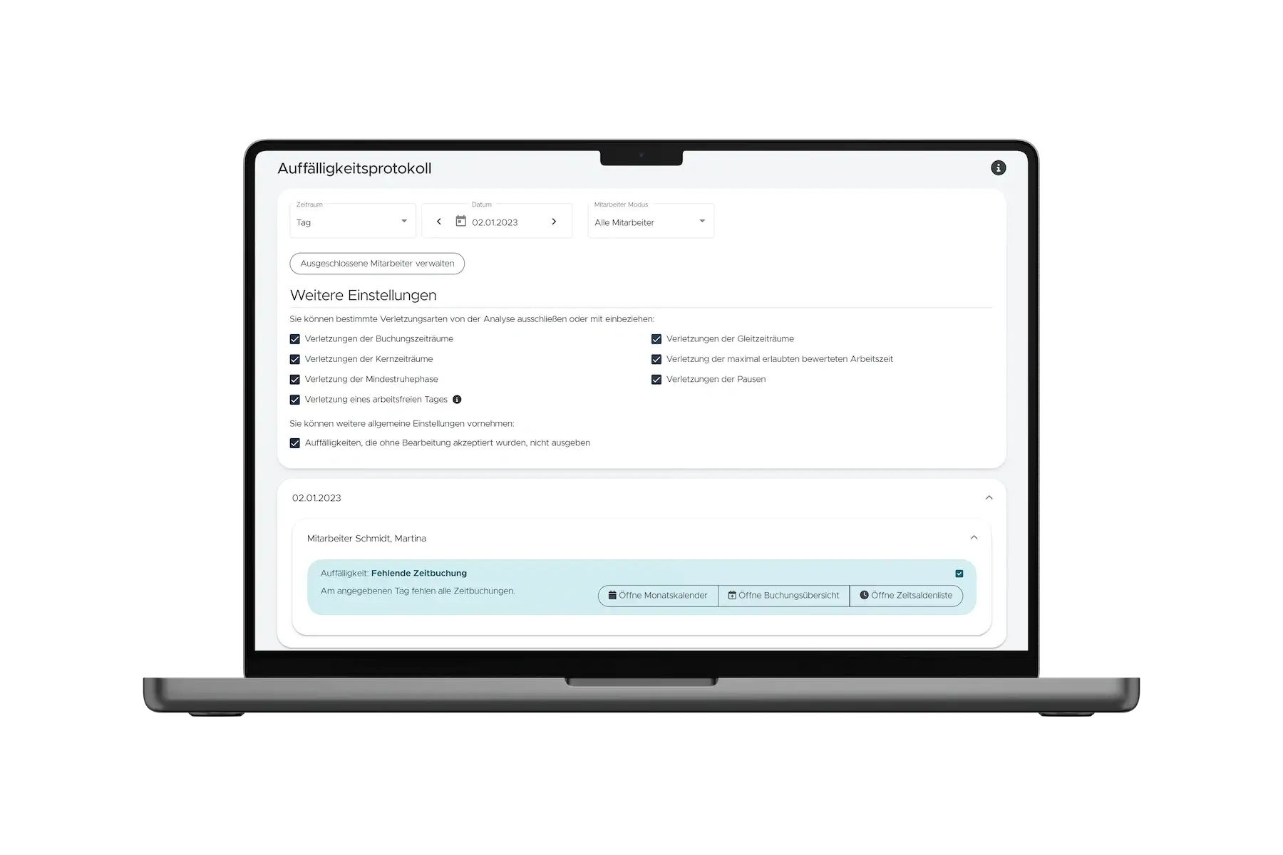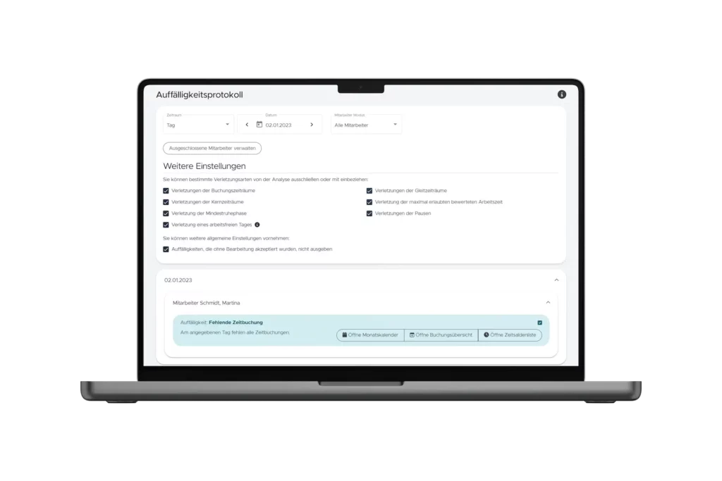 Gibt es vergessene Buchungen oder fehlende Abwesenheitszeiten? Timemaster sortiert gebuchte Zeiten von Terminal, App und PC/Mac, prüft sie und meldet Abweichungen der erfassten Arbeitszeit. Zusammengefasst im Auffälligkeitsprotokoll sind Sie stets bestens über die Abweichungen informiert und können sie strukturiert abarbeiten.