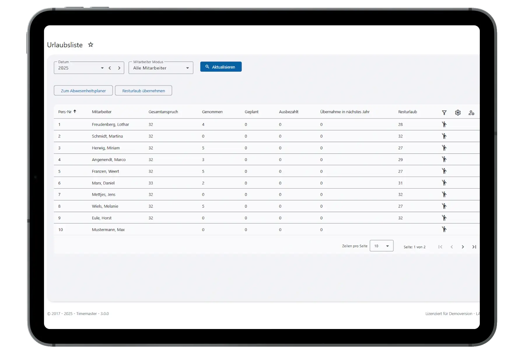 Welcher Mitarbeiter hat bereits wie viel Urlaub geplant und genommen? Wie hoch ist sein Anspruch und wie viel Resturlaub besteht noch? Die Urlaubsliste stellt Ihnen all das übersichtlich zur Verfügung.