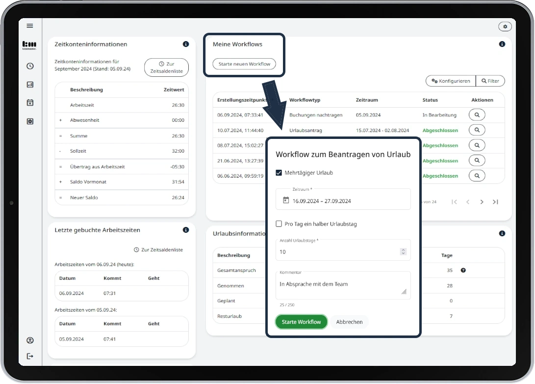 Die Urlaubsplanung erfasst Urlaubsanträge, überprüft verbleibende Urlaubstage und überträgt genehmigte Abwesenheiten automatisch in den Kalender.