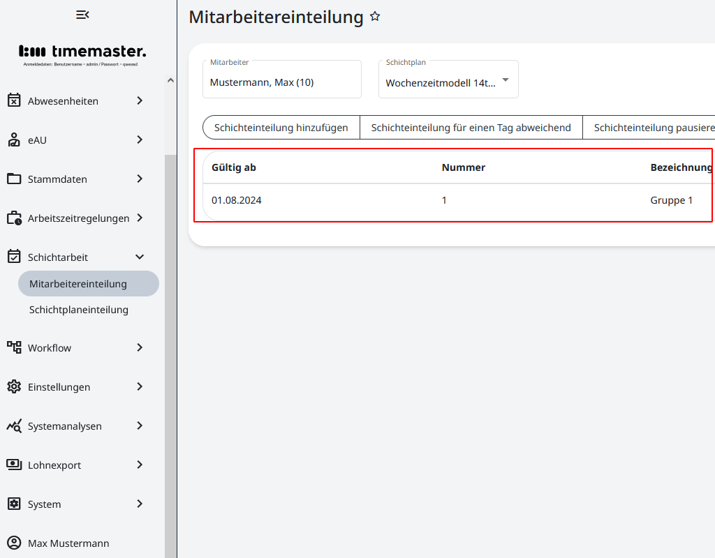 Abschließend muss der Mitarbeiter noch einer Schichtgruppe zugewiesen werden. Dies erfolgt unter Schichtarbeit und Mitarbeitereinteilung. Das Zuordnungsdatum sollte deckungsgleich mit dem Datum des Schichtvertrags im Personalstamm sein, um eine vollständige Bewertung der Zeiten zu gewährleisten.