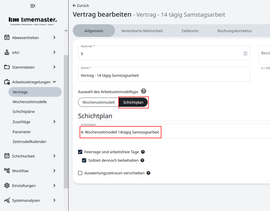 Nachdem der Schichtplan korrekt konfiguriert wurde, erfolgt die Erstellung eines Vertrags unter Arbeitszeitregelungen und Verträge. Der Vertrag erhält einen sinnvollen Namen und wird abgespeichert. Innerhalb des Vertrags wird als Arbeitszeitmodelltyp “Schichtarbeit” ausgewählt. Im Anschluss kann der zuvor erstellte Schichtplan in der Liste ausgewählt werden.