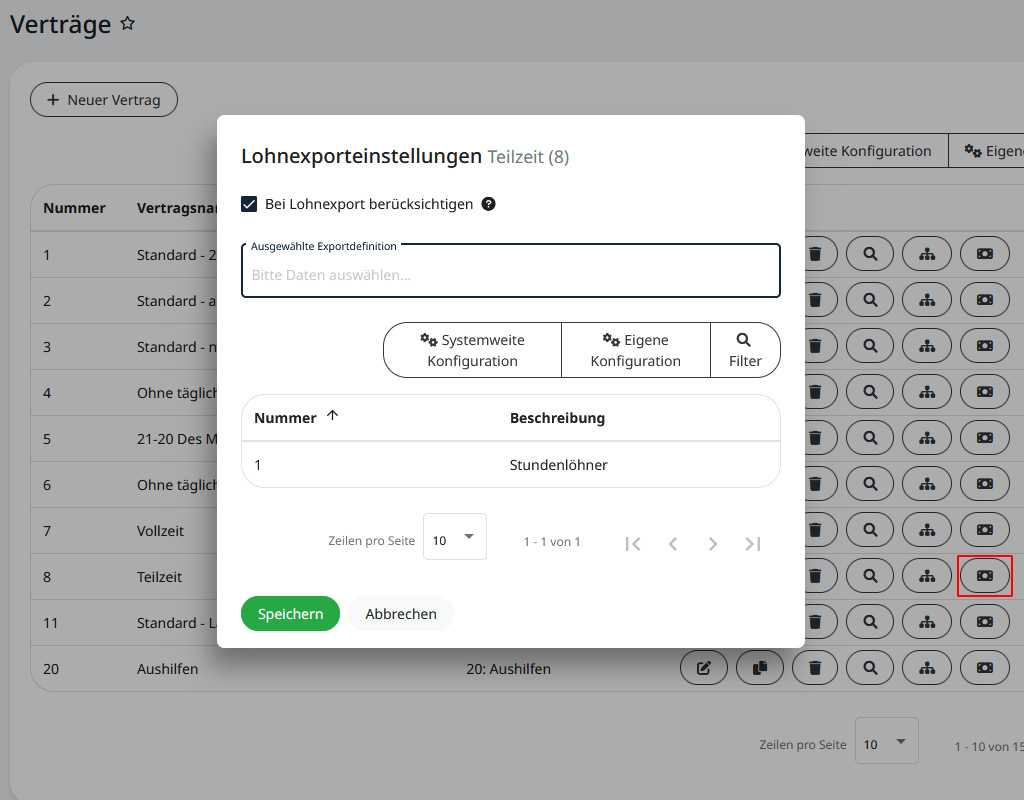 Eine schnelle Zuordnung kann unter “Arbeitszeitregelungen” und “Verträge” mit Klick auf das Geldschein-Symbol neben dem jeweiligen Vertrag erfolgen.