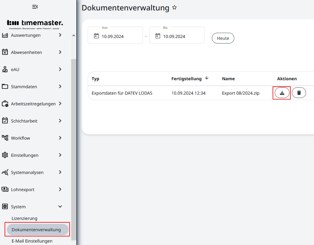 Die erstellte Lohnexport-Textdatei wird in der Dokumentenverwaltung abgelegt und kann später unter  “System” und “Dokumentenverwaltung” heruntergeladen werden.
