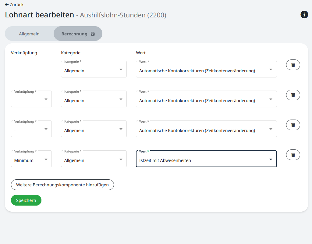 Nach dem Speichern kann im Reiter “Berechnung” die Bewertungsgrundlage für die Lohnart hinterlegt werden. Mittels der zusätzlichen Zeilen lassen sich bis zu fünf einzelne Werte miteinander verrechnen und als Ergebnis übertragen.