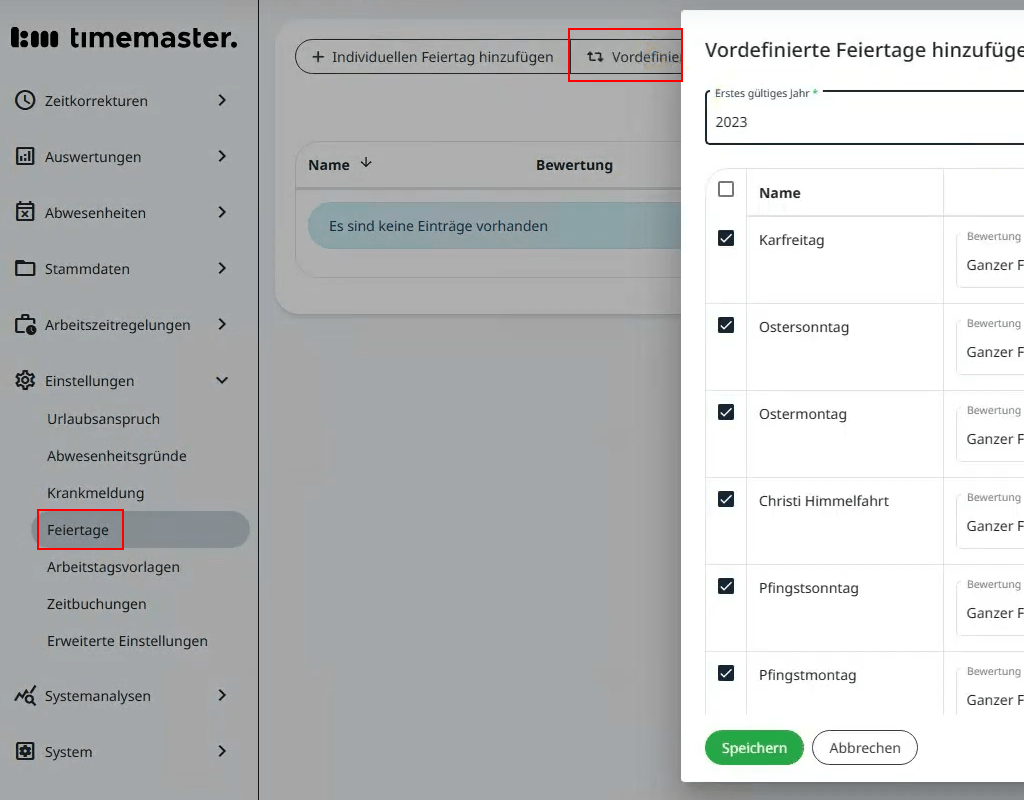 Die Feiertage können unter “Einstellungen” und “Feiertage” hinzugefügt werden. Mit einem Klick auf “Vordefinierte Feiertage hinzufügen” gelangen Sie in eine Liste, in der die deutschlandweiten Feiertage vorgeschlagen werden.