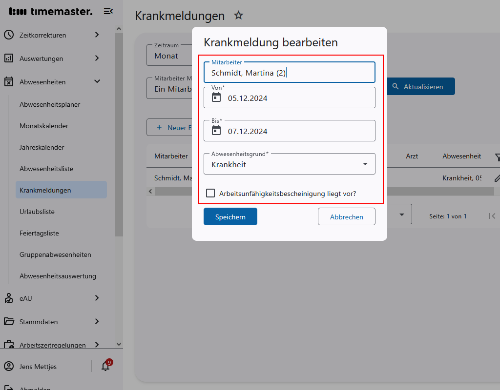 Über den Button “Neuer Eintrag” kann eine Krankmeldung hinzugefügt werden. Neben dem Zeitraum wird auch der Abwesenheitsgrund hinterlegt. Letztlich kann noch ein Haken gesetzt werden, wenn eine Arbeitsunfähigkeitsbescheinigung vorliegt. Die Eingabe wird dann gespeichert.