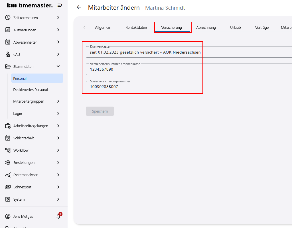 Unter “Stammdaten” und “Personal” erfolgt bei jedem Mitarbeiter im Reiter “Versicherung” die Zuordnung einer Krankenkasse sowie einer Versichertennummer.