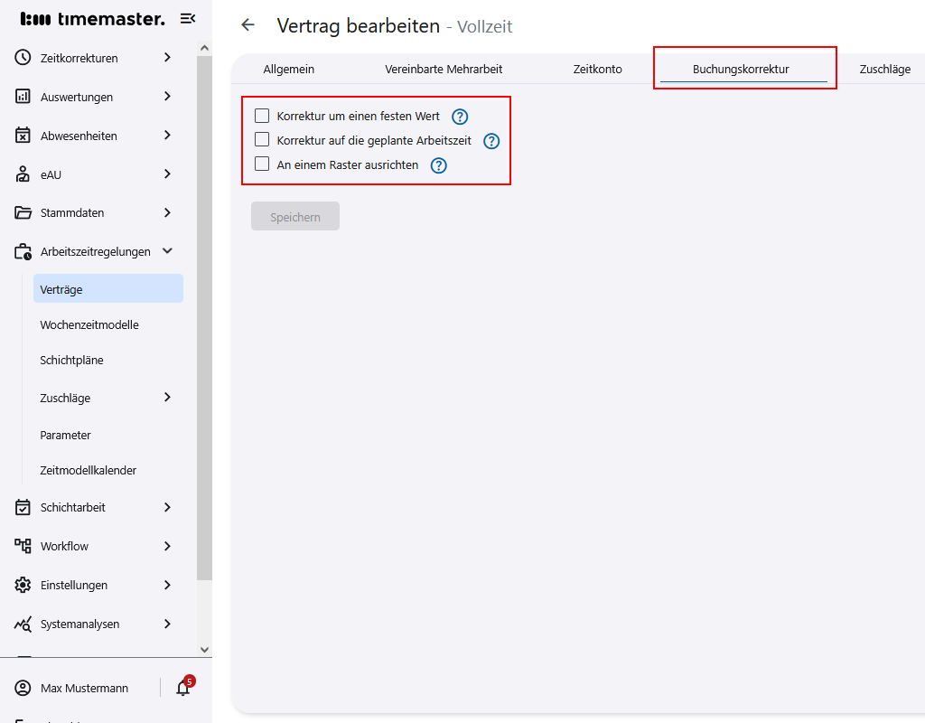 Innerhalb der Verträge lassen sich im Reiter “Buchungskorrekturen” verschiedene Arten von Anpassungen der vom Mitarbeiter gebuchten Zeiten hinterlegen. Nachfolgend werden die einzelnen Funktionen genauer erläutert.