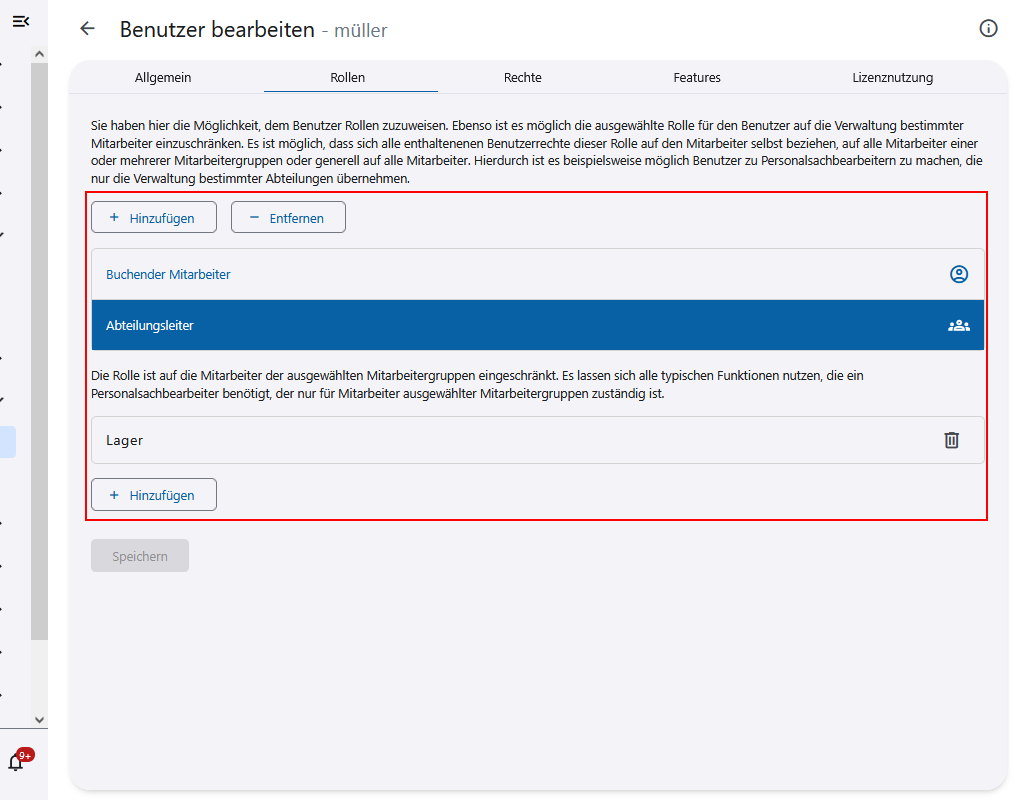 Im Reiter “Rollen” erfolgt die Zuweisung der zuvor erstellten Berechtigungspakete. Wahlweise können dem Login auch mehrere Rollen zeitgleich zugeordnet werden, beispielsweise wenn der Abteilungsleiter einerseits seine Abteilung verwaltet, andererseits jedoch auch als buchender Mitarbeiter selbstständig Zeiten erfassen soll. Bei Zuweisung von Rollen mit Gruppenzugehörigkeit muss im Anschluss noch die entsprechende Gruppe oder Abteilung hinterlegt werden.