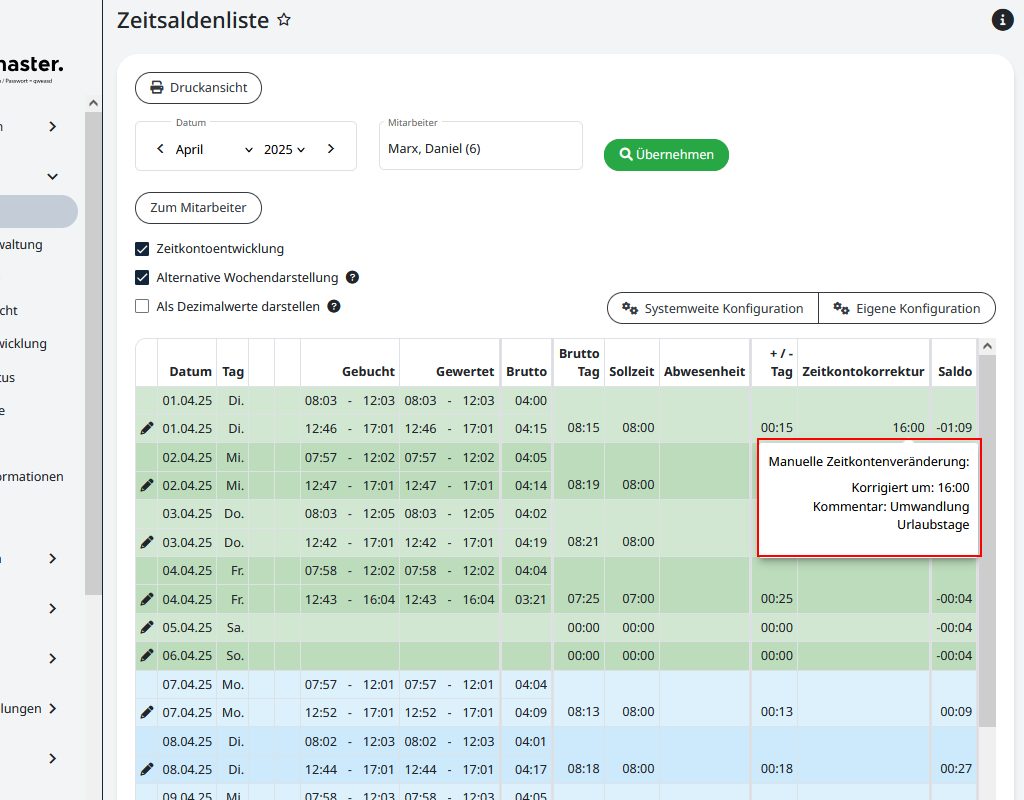 Innerhalb der Zeitsaldenliste ist die fertige Korrektur nun eingetragen und kann beispielsweise ein sich in Zeitschuld befindliches Zeitkonto ausgleichen: