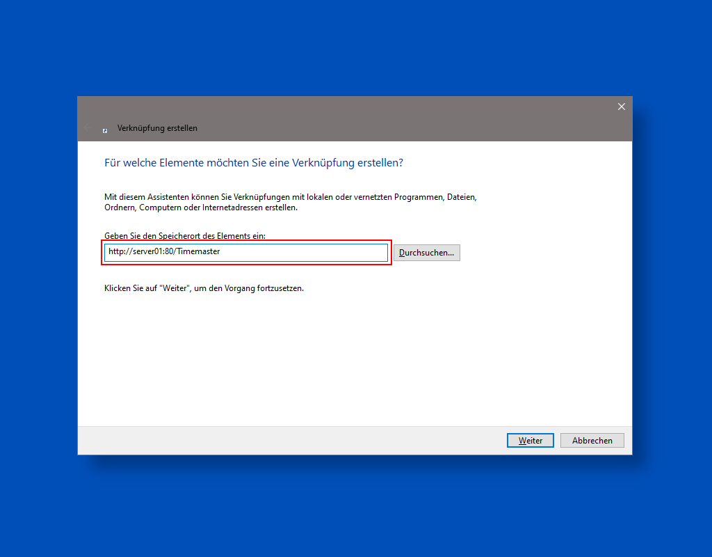Der Zugriff auf die Timemaster Oberfläche erfolgt über die Frontend-URL, beispielsweise http://server01:80/Timemaster.