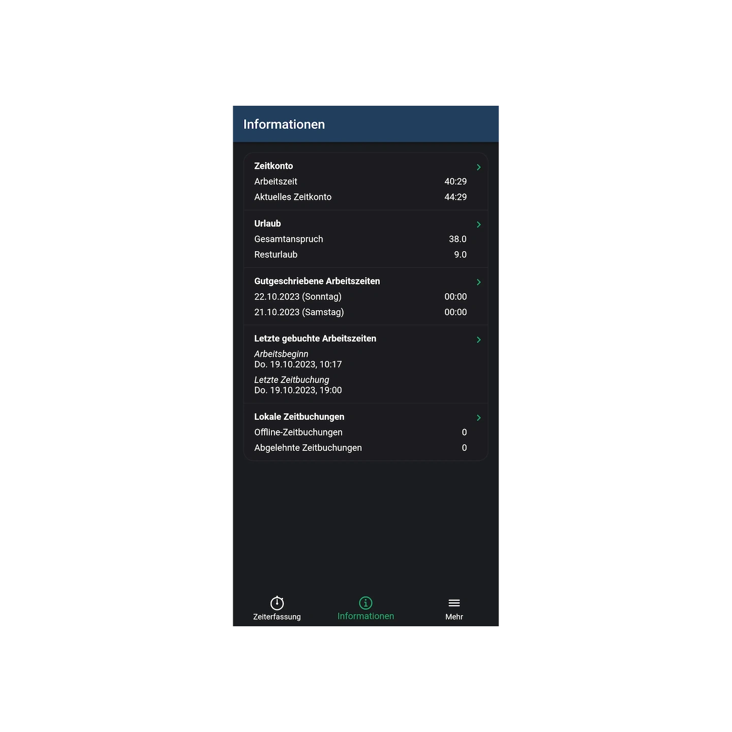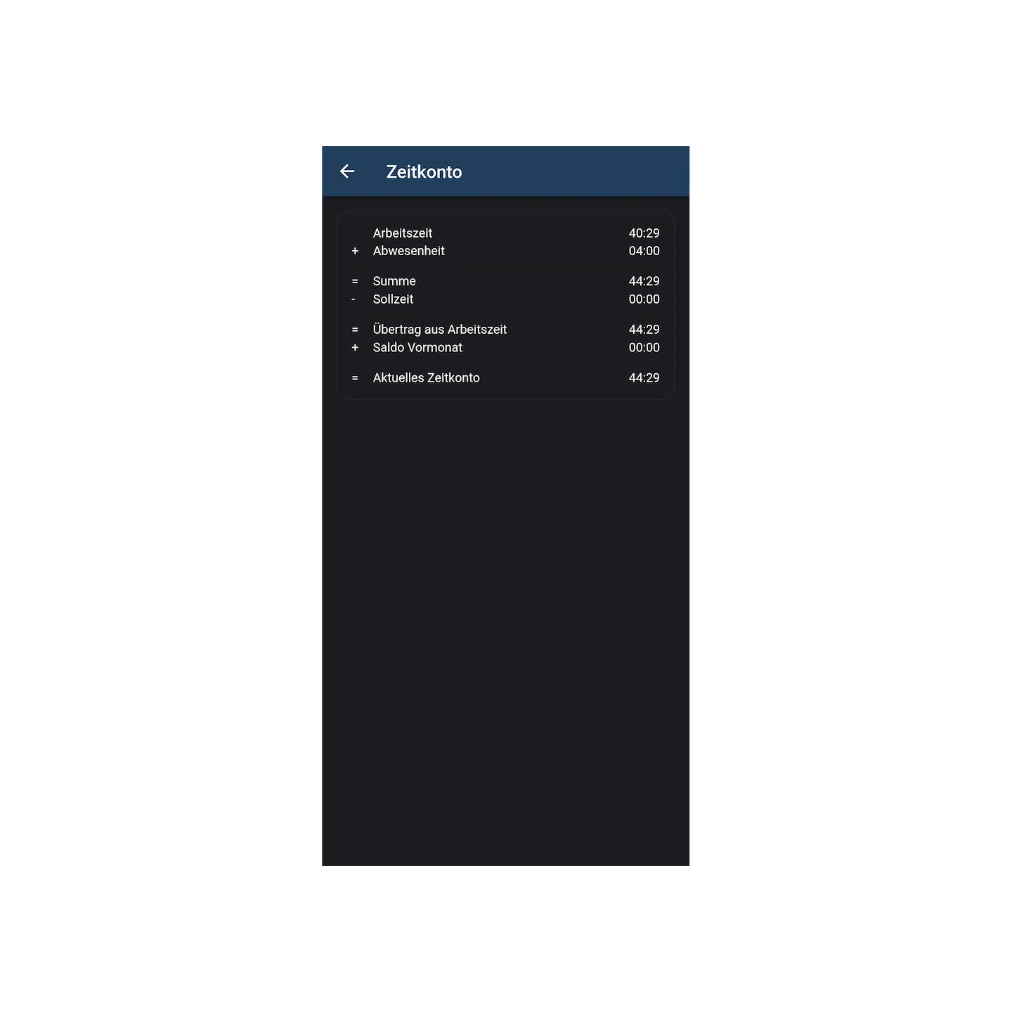 Außer Haus alles auf dem Schirm: Wenn Sie oder Ihre Mitarbeiter unterwegs sind und keine Gelegenheit haben auf einen PC zuzugreifen oder am Terminal zu stempeln, hilft das App-Modul: Damit lassen sich per Smartphone nicht nur Arbeitszeiten erfassen. sondern auch persönliche Daten wie Urlaubsanspruch, Resturlaub oder Zeitkonto einsehen. Alles was Sie brauchen ist die kostenlose Smartphone-App für iOS oder Android sowie das App-Modul, um die Funktion für die berechtigten Mitarbeiter freizuschalten. Manuelles Nacherfassen der Arbeitszeiten von Mitarbeitern, die beispielsweise im Außendienst tätig sind, entfällt und spart viel Zeit und Kosten.