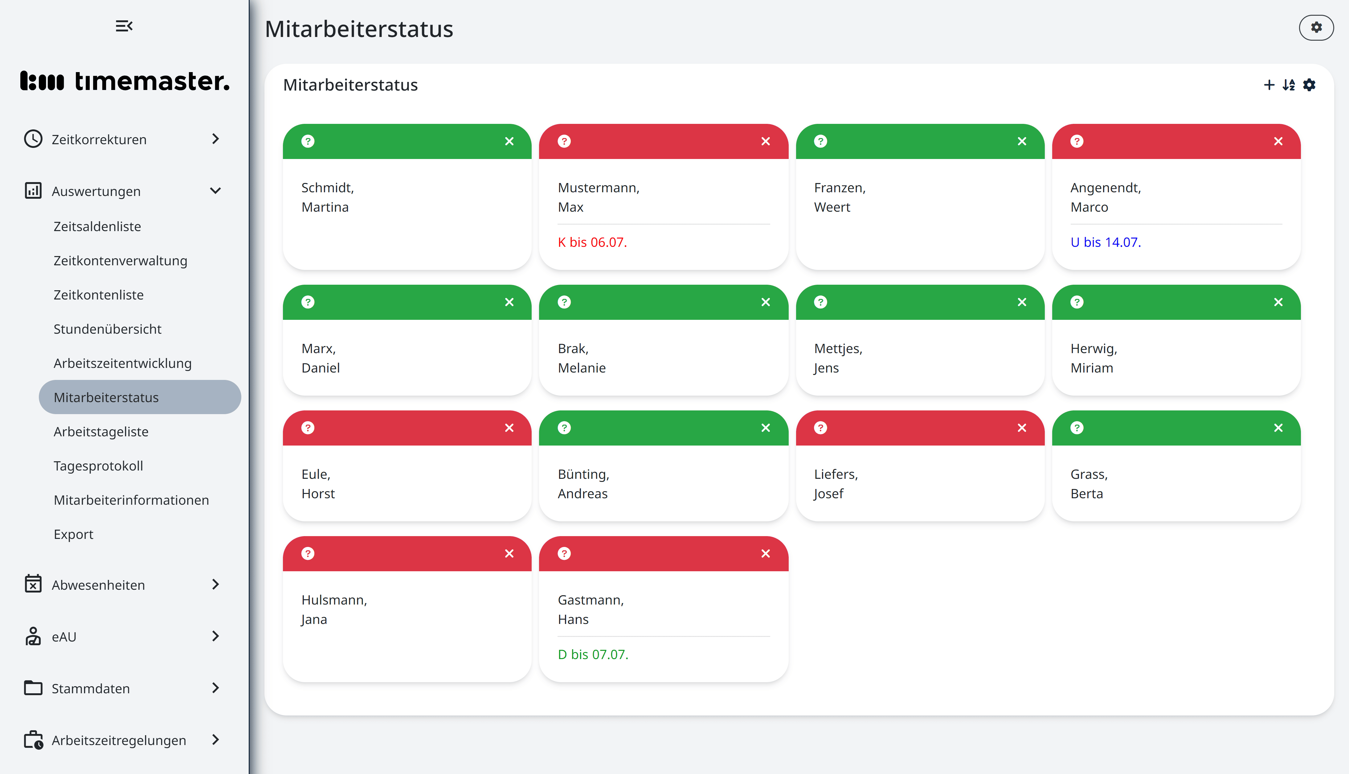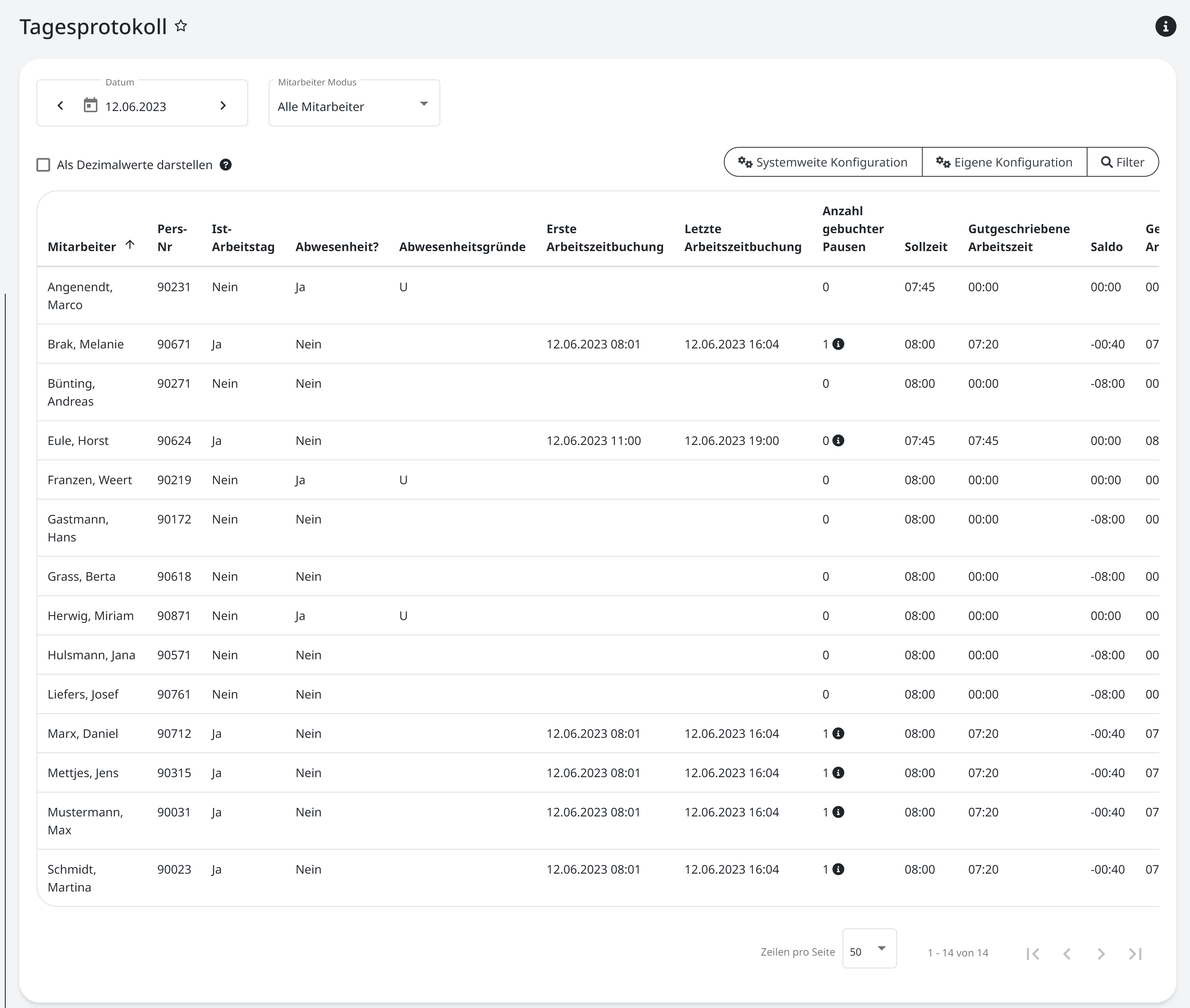 Vertrauen ist gut, Kontrolle ist besser: Das Chef-Modul gibt Informationen über den Mitarbeiterstatus (z.B. ab- und anwesend) sowie bei Bedarf den Abwesenheitsgrund und die Dauer aus. So lässt sich schnell auf einem Blick erkennen, wer anwesend ist und wer aus welchem Grund aktuell nicht da ist. Das Tagesprotokoll enthält als weiteren Bestandteil für einzelne Tage Auswertungen in tabellarischer Form zu Arbeitszeiten, erster und letzter Buchung oder Anzahl gebuchter Pausen. Hiermit können auf einfacher Weise auch vergangene Tage bequem analysiert werden.
