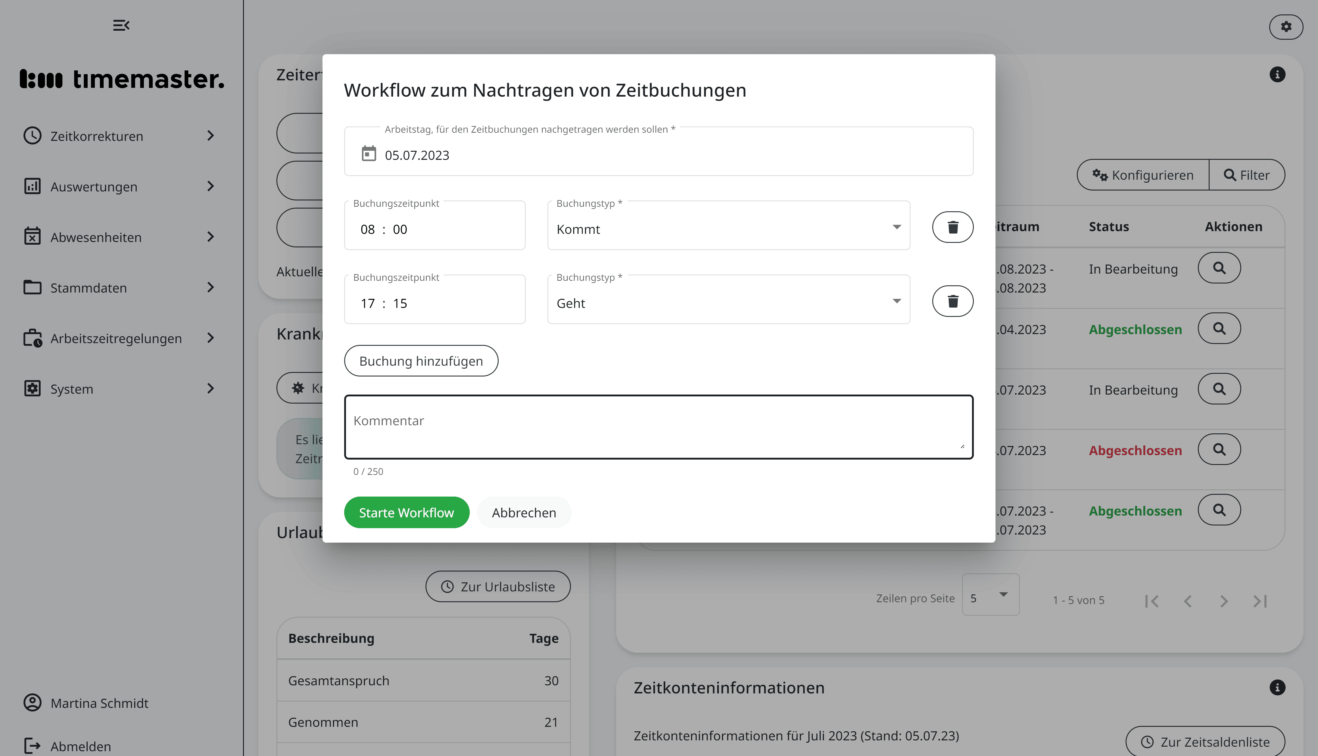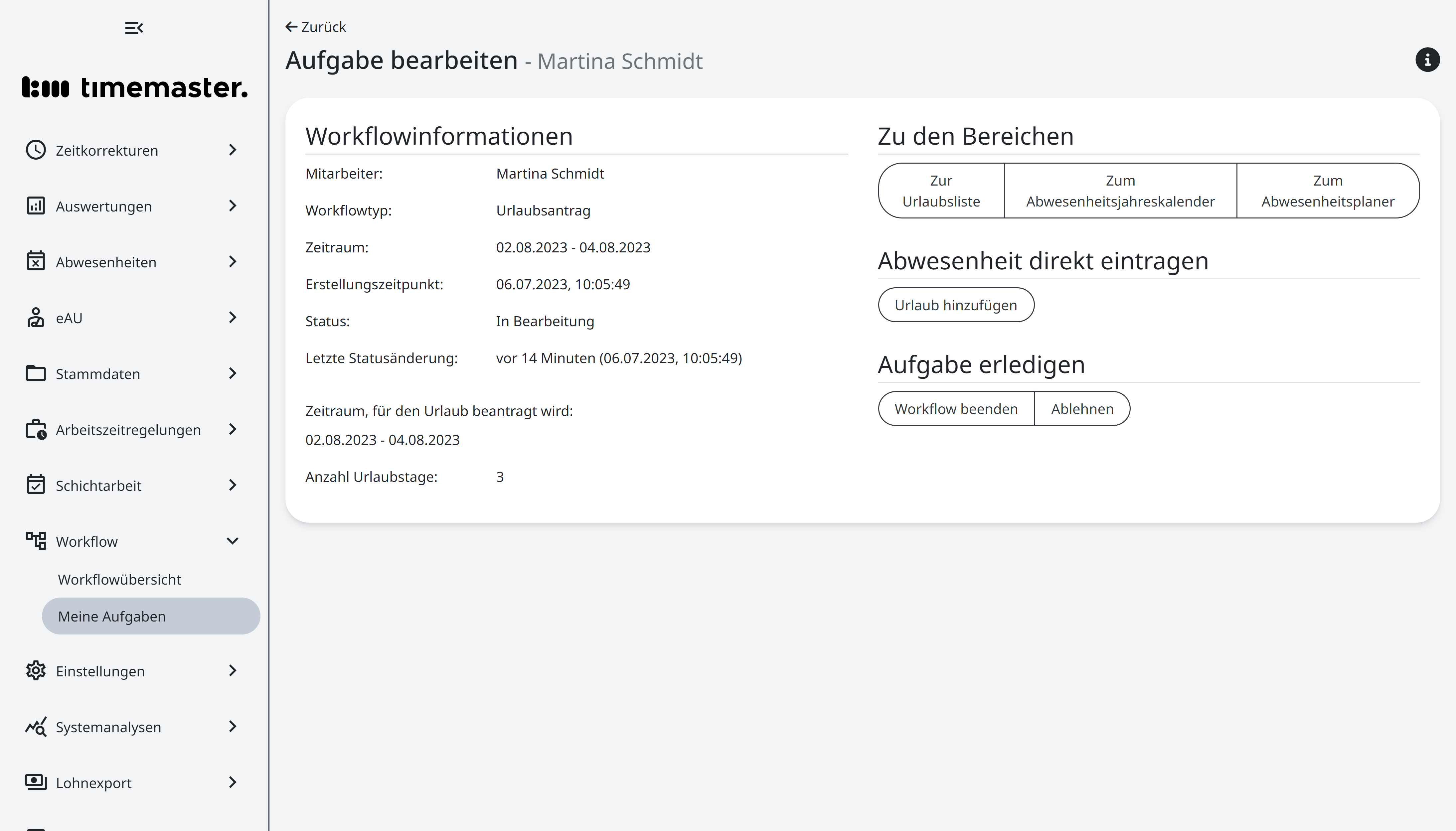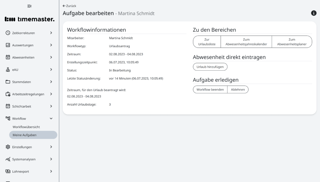 Am Ende der Workflowprozesse prüft der zuständige Personalsachbearbeiter die beantragten Daten bevor sie final im Zeiterfassungssystem übernommen werden und der Prozess abgeschlossen wird.