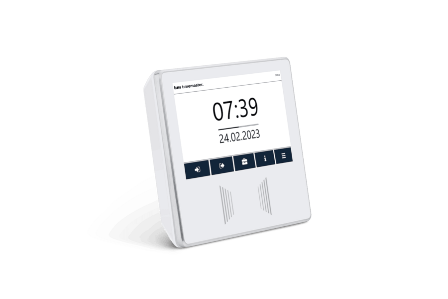 Das Timemaster Terminal plus7 pro ist die neueste Gerätegeneration. Das moderne, schlichte Design in den Farben weiß oder schwarz ermöglicht eine Anbringung sowohl in repräsentativen wie auch in anspruchsvolleren Umgebungen. Die Bedienung erfolgt intuitiv über ein Touch-Farbdisplay. Der robuste, polierte Metallrahmen, der das Terminal vor groben Beschädigungen schützt, rundet das Design ab.