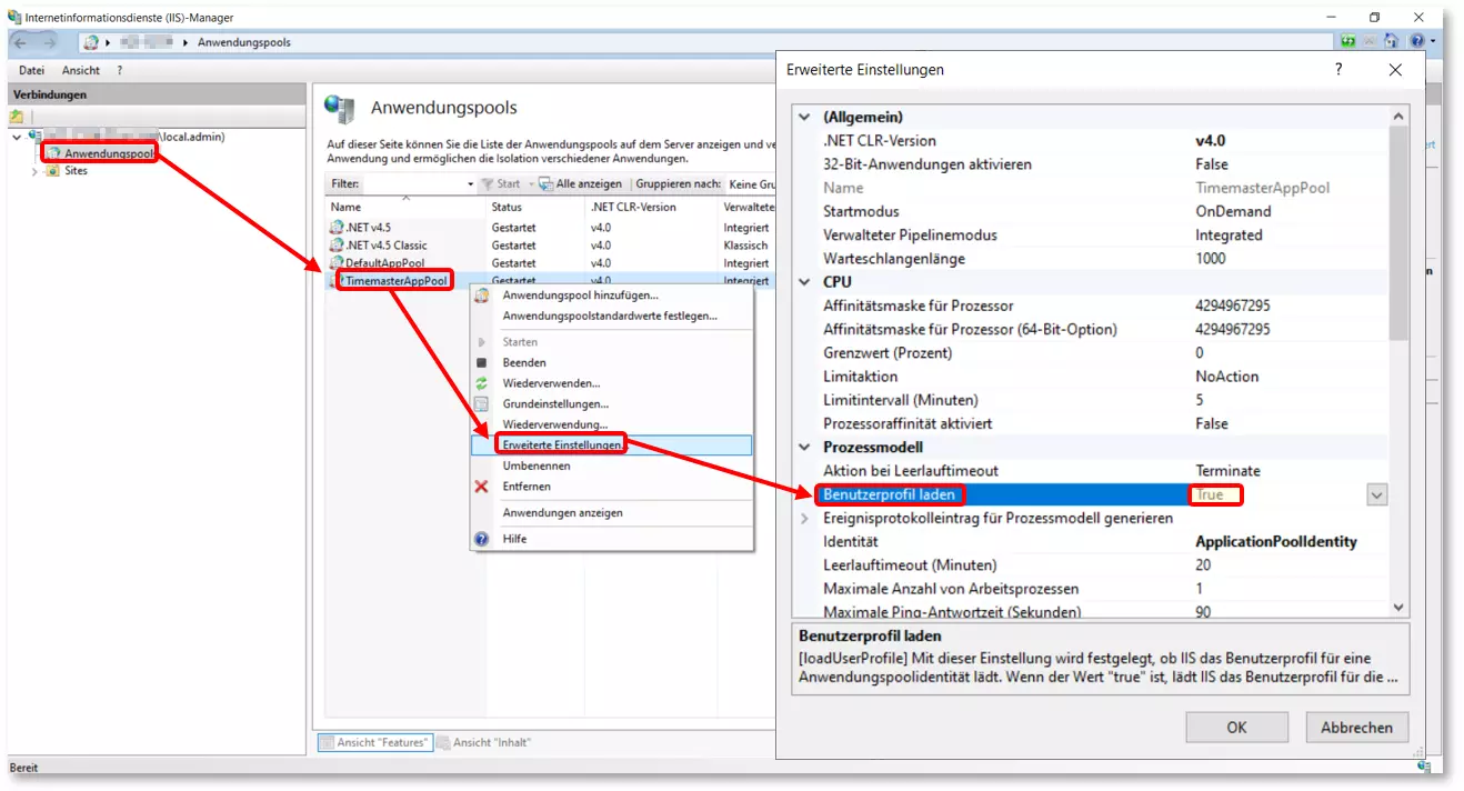 Zur Behebung wird der IIS Manager (beispielsweise über den Timemaster Configuration Manger per Button “IIS-Manager öffnen”) aufgerufen und dort im linken Navigationsbereich unter Anwendungspools der “TimemasterAppPool” per Rechtsklick aufgerufen sowie in “Erweiterte Einstellungen” unter Prozessmodell der Wert für “Benutzerprofil laden” auf den Wert “True” eingestellt (Screenshot).